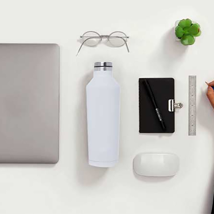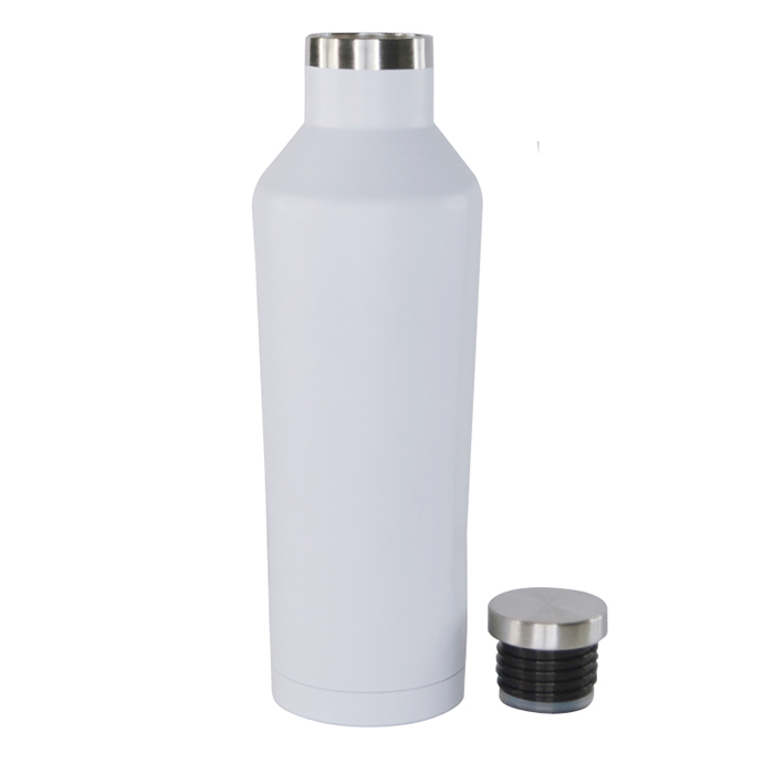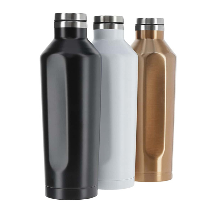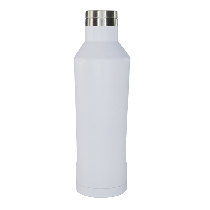 Double wall stainless steel bottle with 12 hours of cold liquid storage and 8 hours of warm liquid storage, this insulated water bottle comes with a unique shape and a wide-mouth opening. 450 ml capacity. Leakproof design.