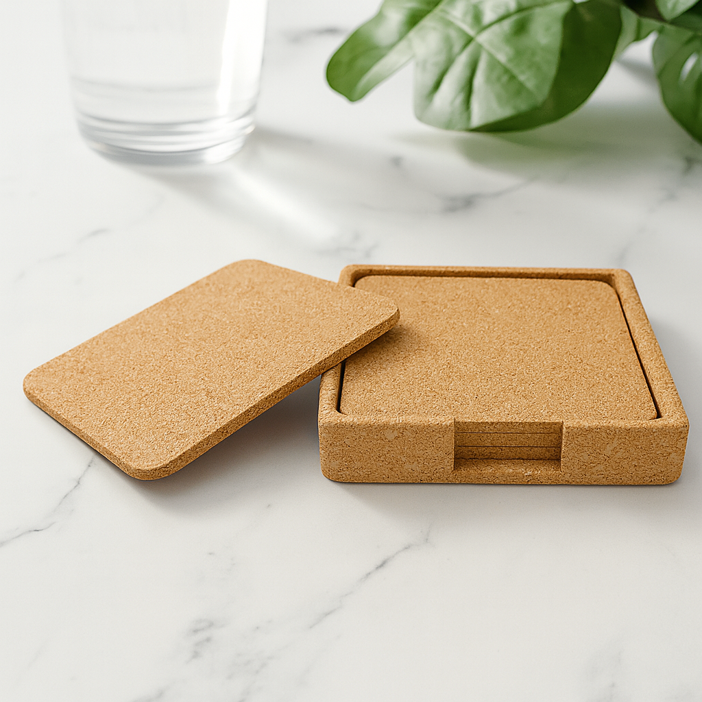Elevate your table setting with this set of four natural cork coasters, each designed to protect surfaces while adding a touch of eco-friendly style. Crafted from durable, sustainable cork, these coasters come with a matching cork stand for easy storage and organization. Perfect for everyday use or special occasions, they make an ideal gift and come beautifully packaged in a gift box. A thoughtful blend of functionality and natural charm for any home or office space.