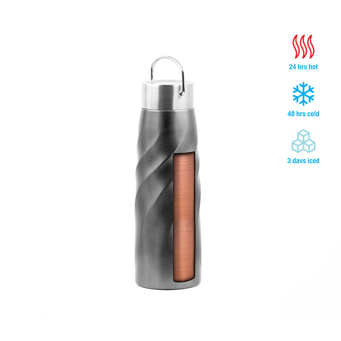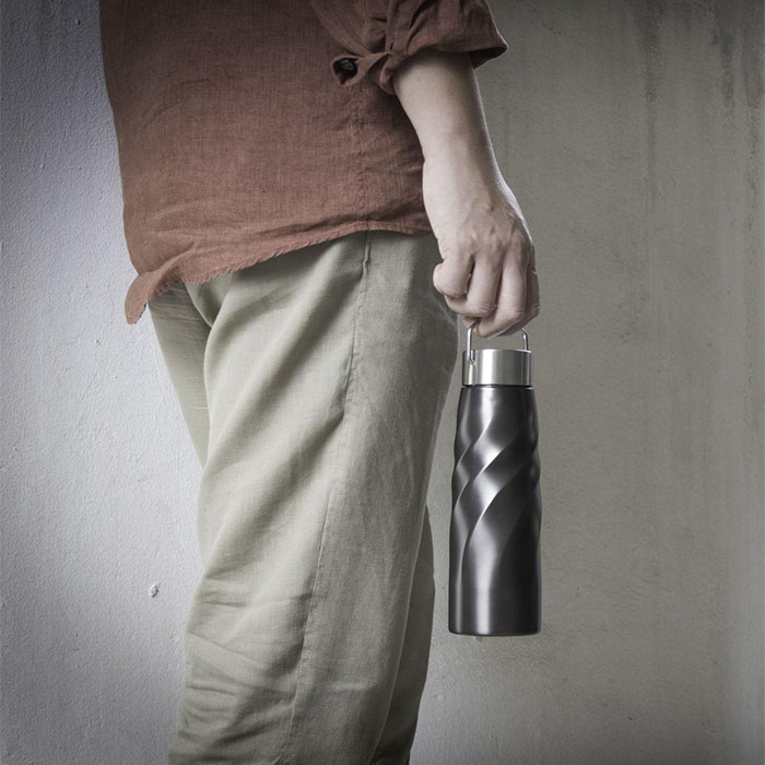 Elevate your hydration where elegance meets sustainability. Crafted from recycled 304 stainless steel, this vacuum bottle combines refined design with eco-conscious values. Inspired by ocean vortex patterns, its sculpted form captivates the eye while delivering a luxurious tactile experience. The smooth glide of the cap reflects its exceptional quality. Every detail invites indulgence, making not just a bottle, but a statement of mindful, everyday luxury. Beauty, function, and responsibility in harmony. 500 ML.