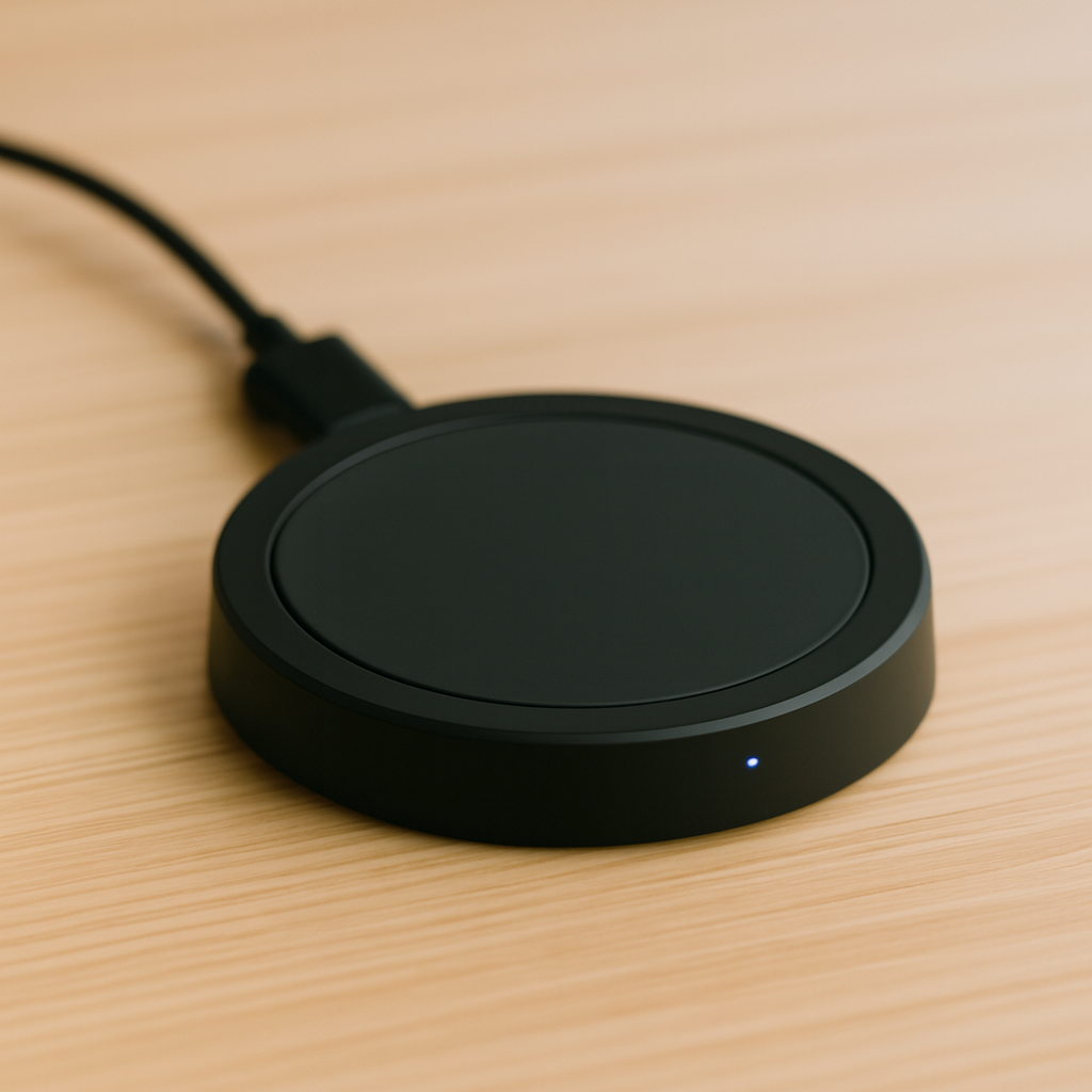 Wireless charger. Connect device to your computer, place smartphone on it to begin charging. Light when charging. Output: DC5V/0.8A. Compatible with latest Androids, iPhone® 8, 8S and X and newer.