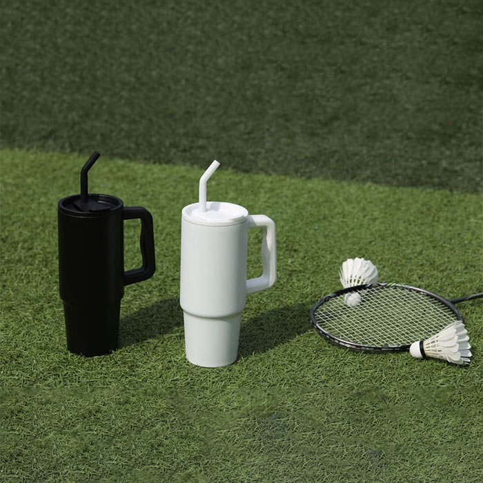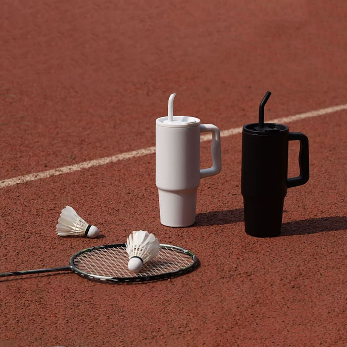 Stay hydrated in style with this eco-friendly 900ml tumbler, made from 70% GRS-certified recycled stainless steel. Perfect for commutes, workouts, or day trips, it features a rotating lid cap for easy drinking and a reusable stainless steel straw. The ergonomic handle with comfort-grip inserts ensures easy carrying, while the narrow base fits most car cup holders. Keep your drinks hot for up to 5 hours or cold for 15 hours. Comes packaged in a sustainable kraft box.