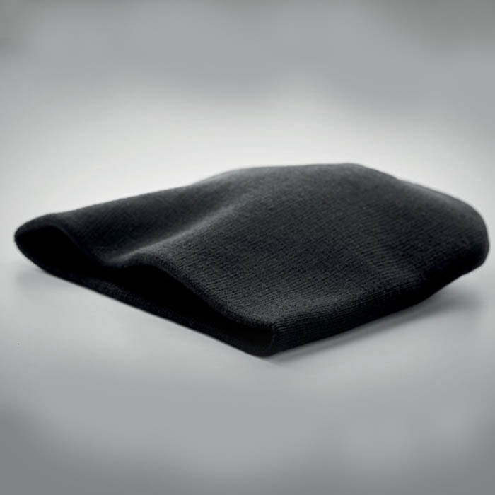 Unisex knitted beanie hat in soft stretchable RPET polyester .