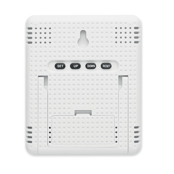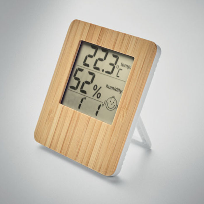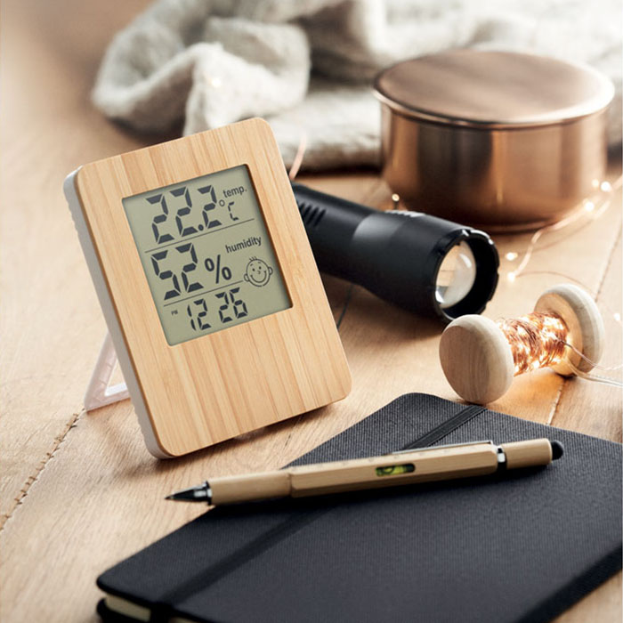 Monitor current temperature, humidity, and time with this stylish weather station and clock featuring a natural bamboo front. Ideal for home or office, its bamboo casing adds a rustic charm, doubling as a decorative piece. The station includes a thermometer, hygrometer, and calendar, all displayed clearly for easy reading. Note that due to the natural variations in bamboo, each piece may differ slightly in colour and size, contributing to its unique aesthetic appeal. Please note, 2 AAA batteries are required for operation (not included). Enhance your space with this functional yet aesthetically pleasing addition.