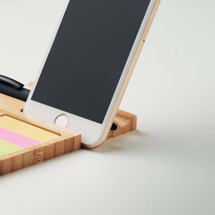 Bamboo desk phone stand with paper clips and sticky notes. An organized office is a productive office. Keep your desk clean and use an organizer to store smaller office supplies in one place. This bamboo stand also has a holder for your smartphone. Bamboo is a natural product, there may be slight variations in colour and size per item, which can affect the final decoration outcome. Size 9×16,5×0,8 cm.