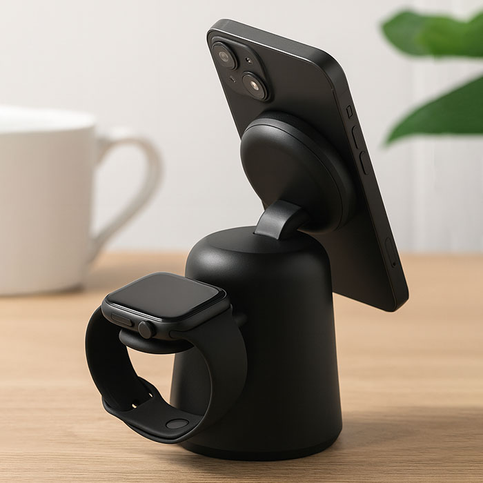 3-in-1 charging station in durable ABS features a 15W magnetic wireless charger designed for iPhone® 12 and newer, complete with a convenient phone holder. It supports TWS earbuds and includes a dedicated smartwatch charger compatible with iOS devices. The magnetic charging is enhanced by an additional metal ring, allowing seamless charging for non-magnetic wireless-enabled phones. Stylish and practical, this station keeps all your essential devices powered and organized in one compact hub.
