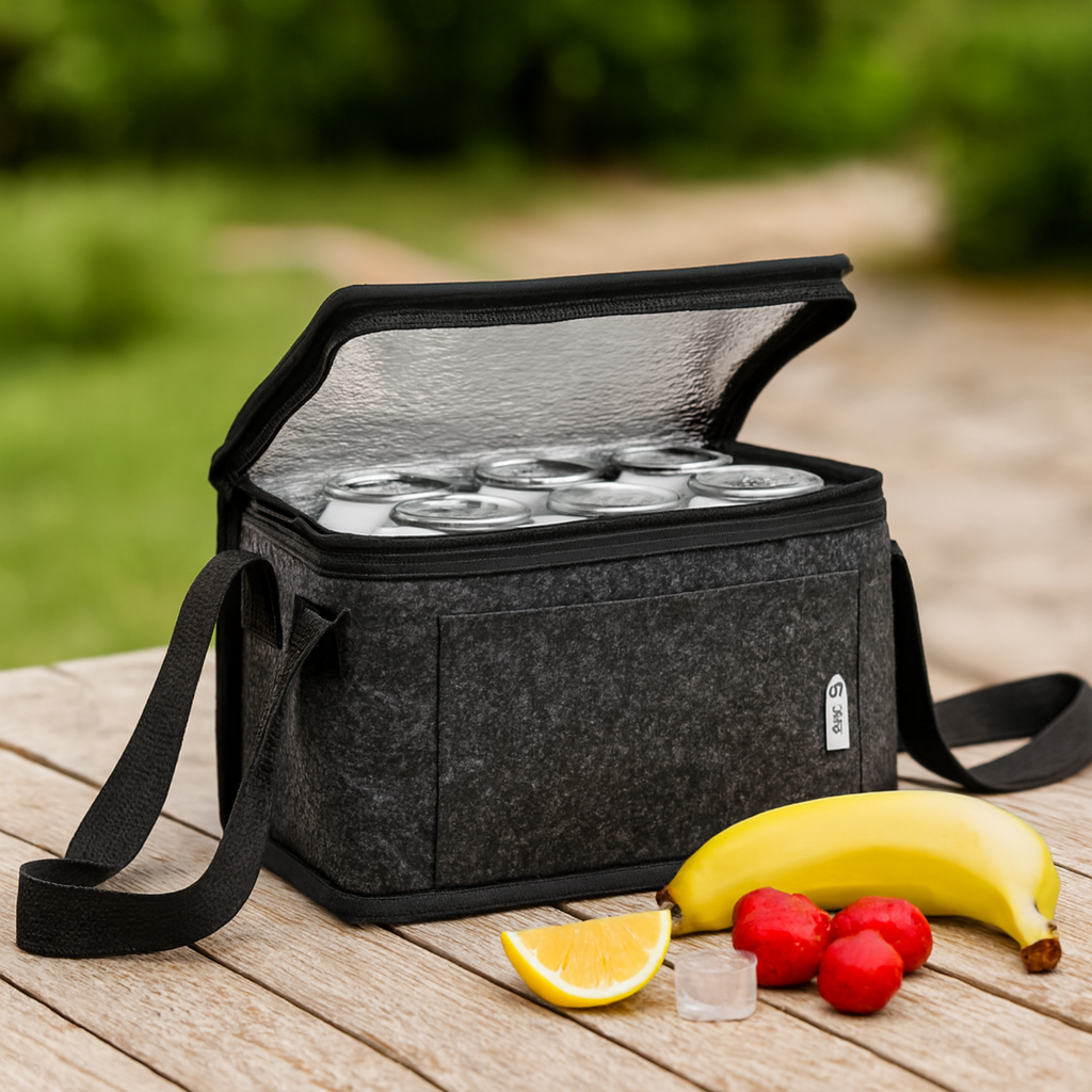 Keep your food and drinks fresh with this eco-friendly RPET Felt Cooler Bag. Made from 1mm RPET felt with 3mm insulated aluminium-laminated foil, it ensures excellent temperature retention. The 5L capacity is perfect for lunches, picnics, or snacks on the go. A convenient front pocket provides extra storage for utensils or napkins. Lightweight yet durable, this sustainable cooler bag is a stylish and practical choice for daily use.
