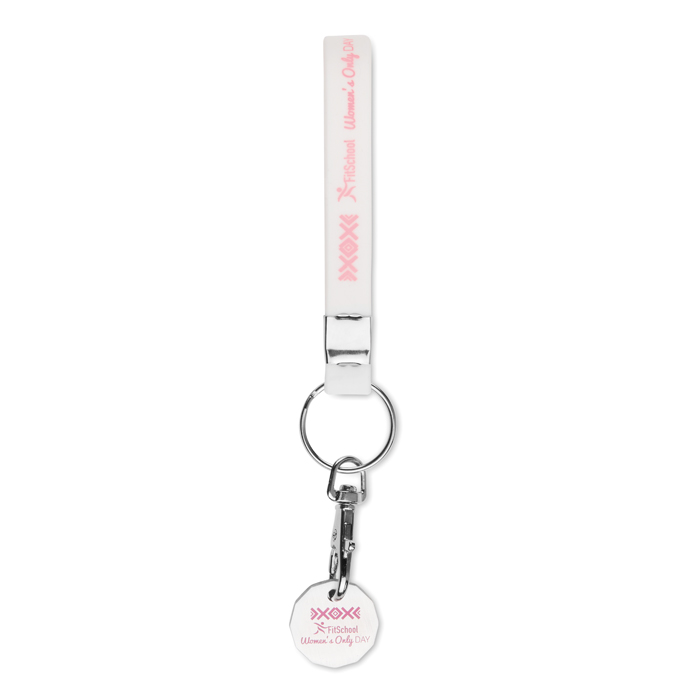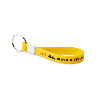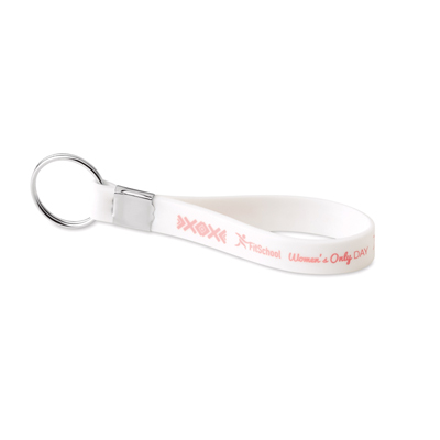Brand Colour matched silicone key ring with metal clamp and split ring (dia.30mm). Logo designs can be printed, embossed or debossed on the silicone strap.