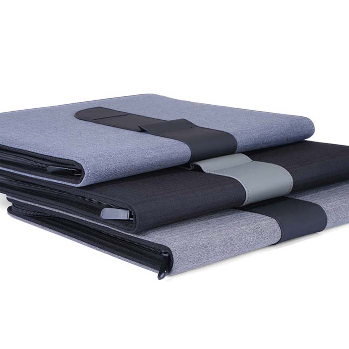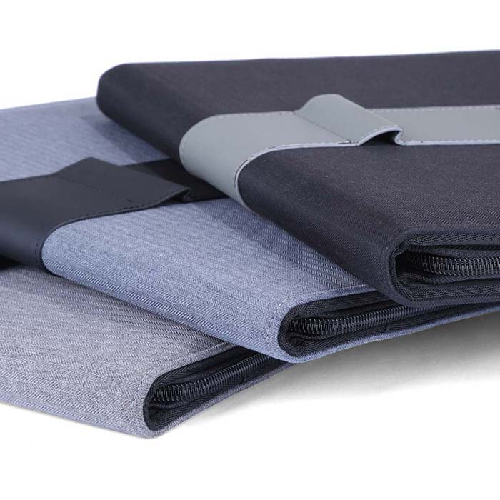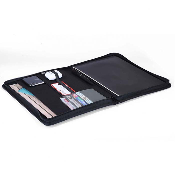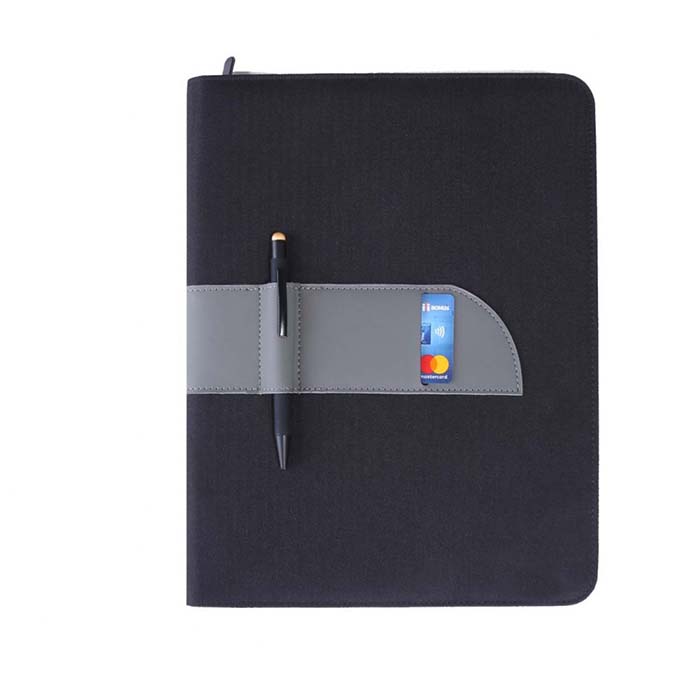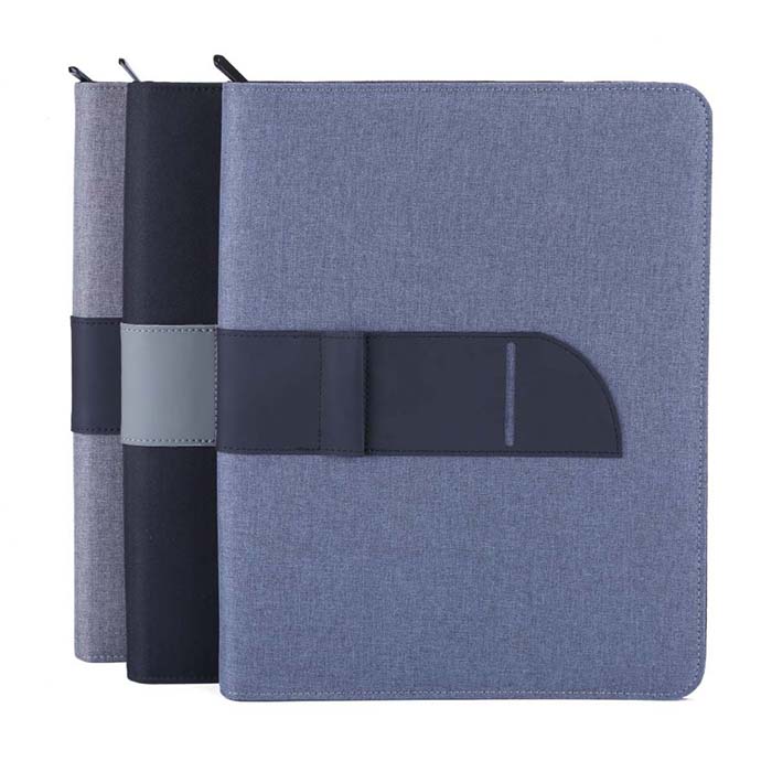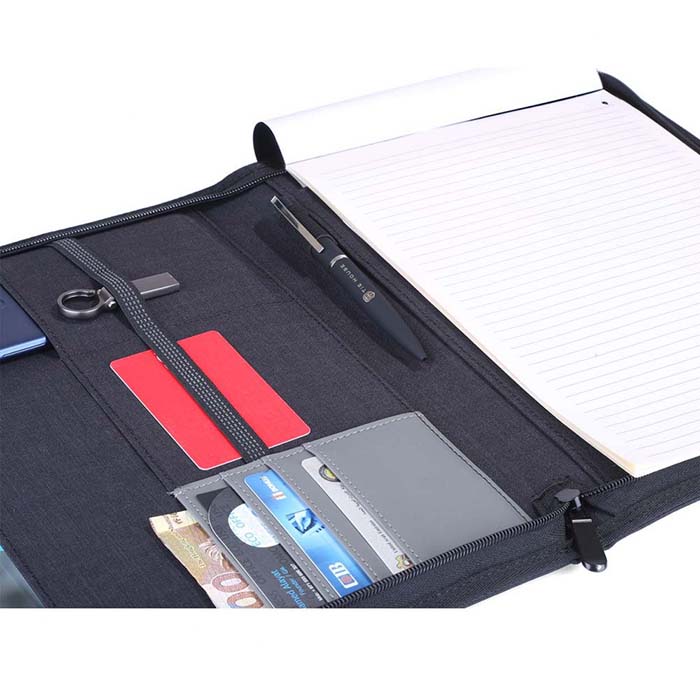 A4 size Folder made with linen material and PU strap. Zipper closure with slots on the inside forcarrying mobile, documents and cards. Also contains a 25 sheets memo notepad. Packed in white paper box.