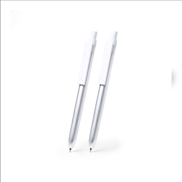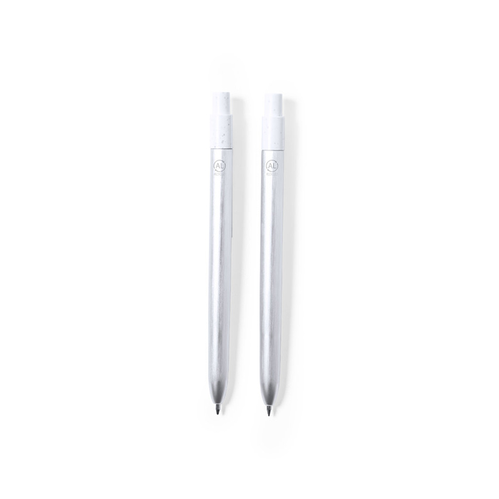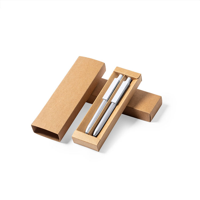 Your sustainable solution for your writing needs – Taeyin. Crafted from recycled aluminum, this writing gift set embodies environmental consciousness. It features a sleek silver matt aluminum pen with 1.0 mm blue ink and a mechanical pencil with 0.7 mm lead. Aluminum construction provides durability without adding unnecessary weight, for easy note making. The brushed metal finish add a touch of sophistication. Packed in craft paper gift box.