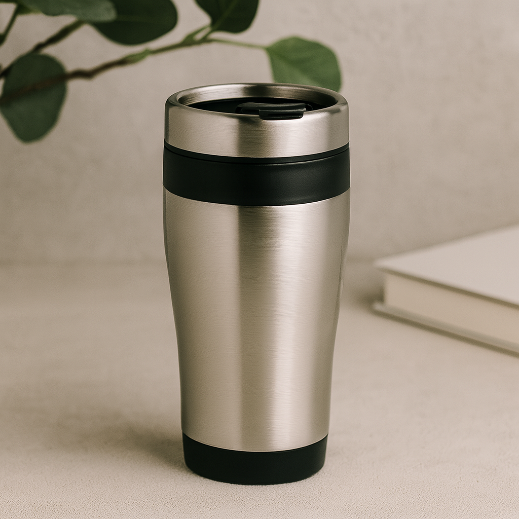 Double wall stainless steel travel cup with inner PP and lid. Capacity: 455 ml.