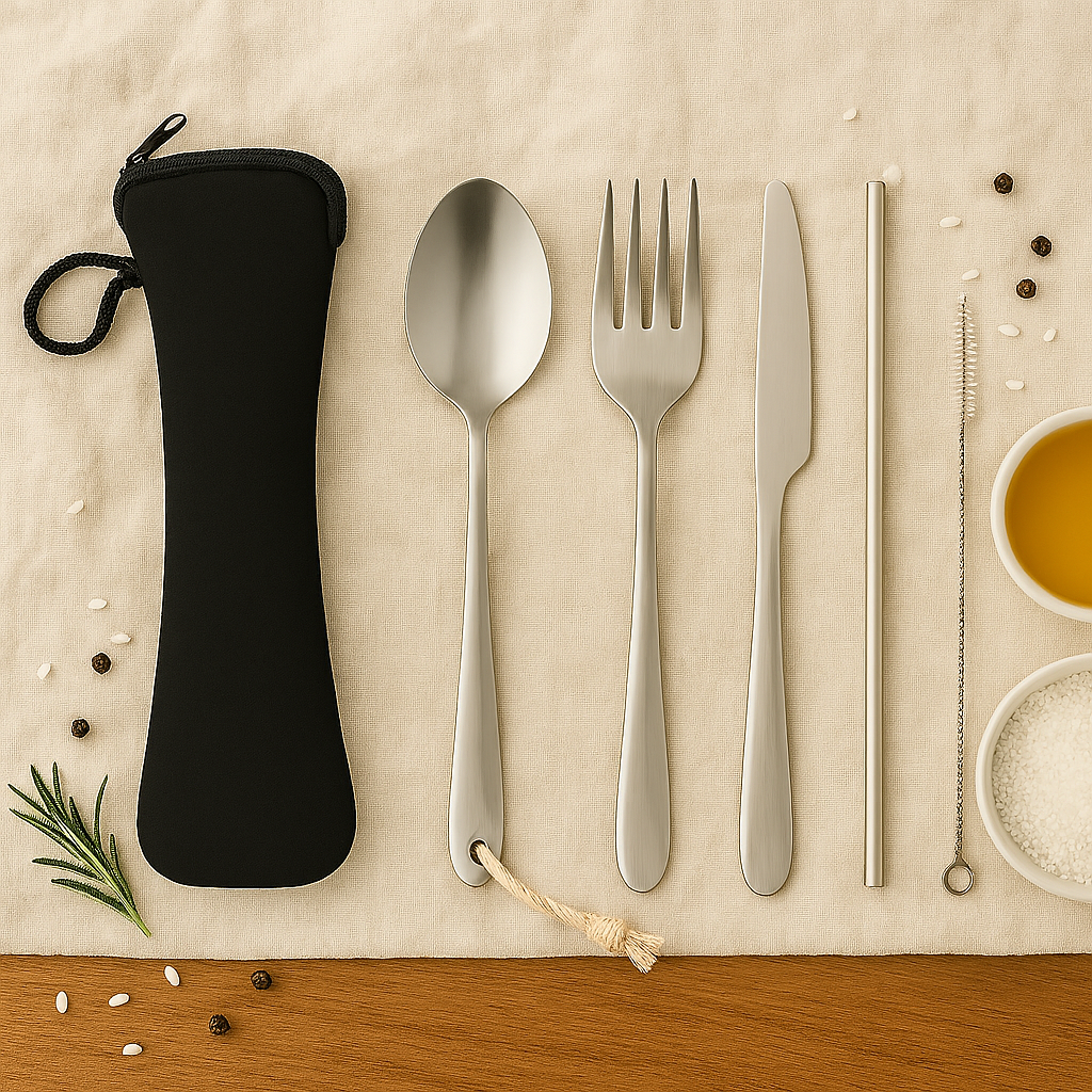 Re-usable stainless steel cutlery set including fork, knife, spoon, straw and brush in neoprene pouch.