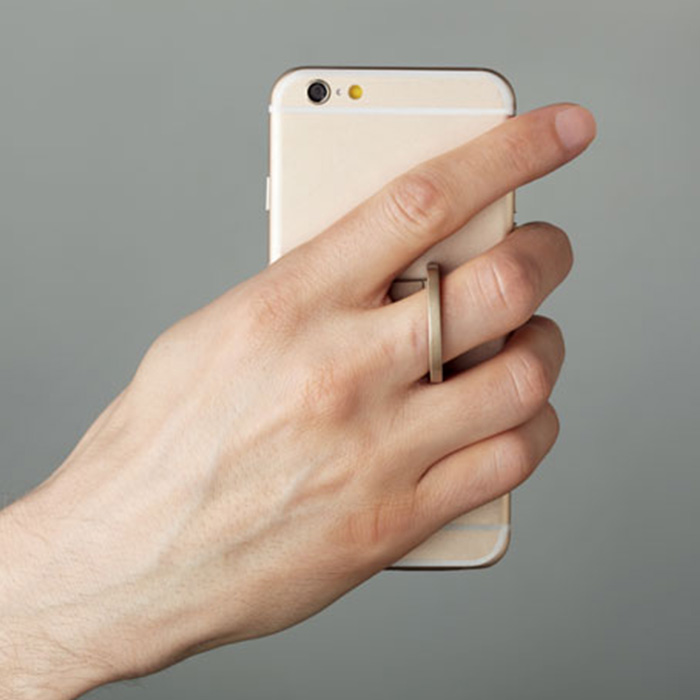 Phone holder with ring in matt zinc alloy. 3M sticker on back.