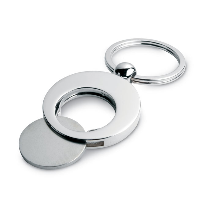 Round shaped metal key ring with trolley token.