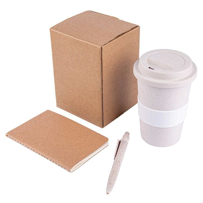 An Eco Gift set comprising a 380 ML wheatsraw tumbler, an A6 size notebook with 80 FSC certified pages and a sustainable wheatstraw material pen. Packed together in a recycled paper box.