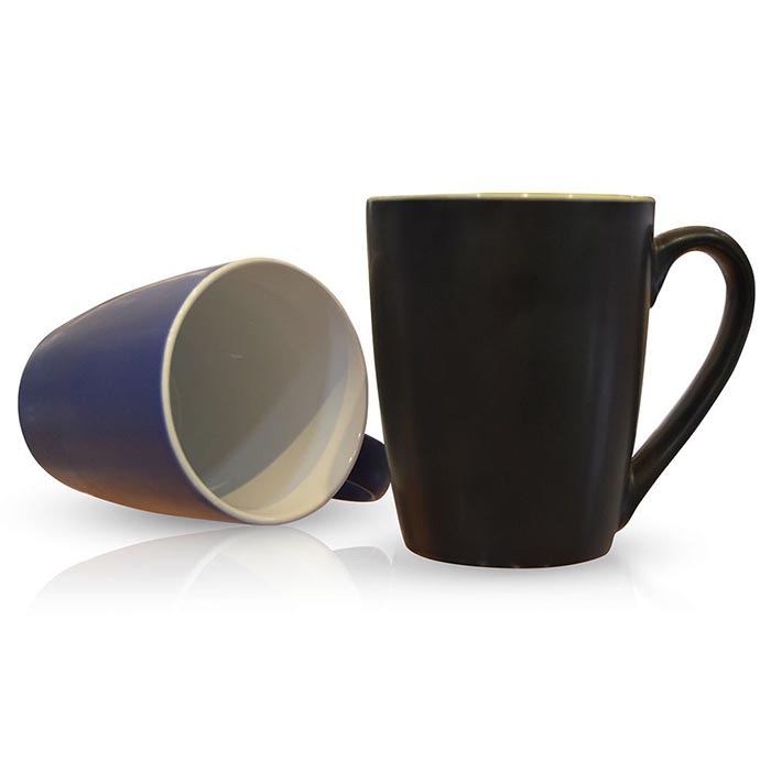 A two tone, matt finish ceramic cups with 12 oz capacity packed in individual paper boxes