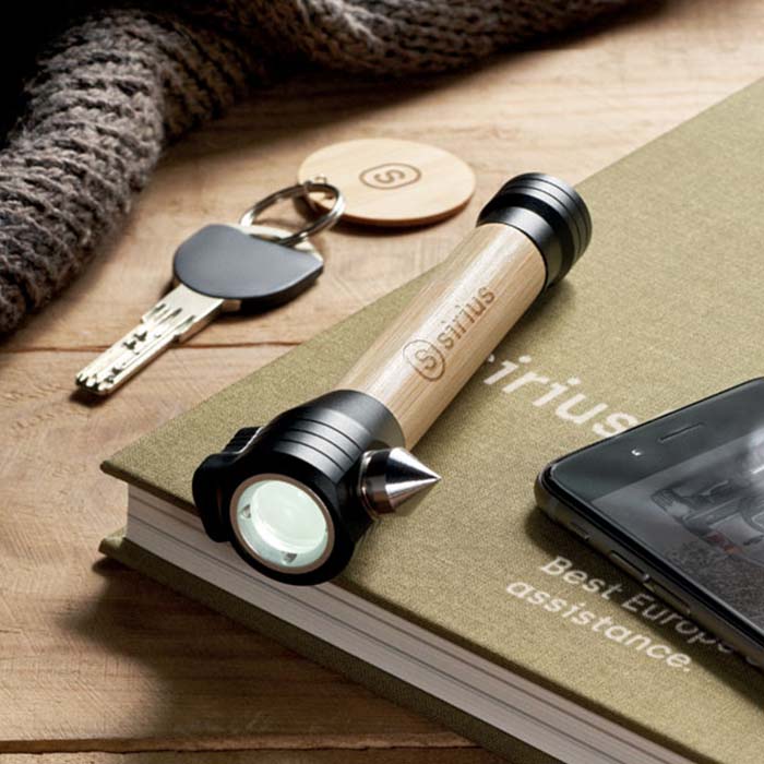 3 in 1 bamboo torch with safety hammer and seat belt cutter. It has a magnetic base. Output lumen: 60. 2 AAA batteries excluded. Bamboo is a natural product, there may be slight variations in colour and size per item, which can affect the final decoration outcome.
