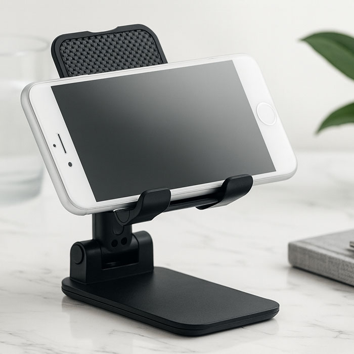 Foldable and extendable desktop phone stand in ABS.