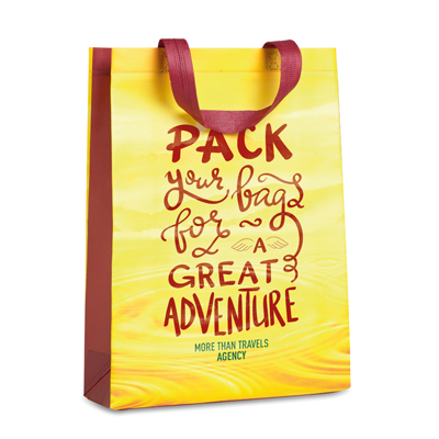 Vertical shopping bag with long self material or PP webbing handles. Completely tailormade to your requirements. Choice of materials RPET, PP woven, Non woven and non woven with lamination.Tmeline 3 weeks for sample and 4 weeks for bulk production. Freight by Air 10 days and by Sea 6 weeks.