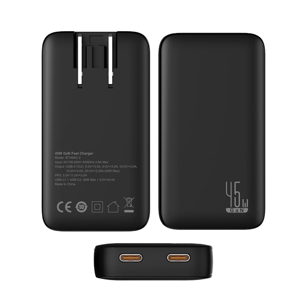 A sleek and ultra-compact travel charger built for efficiency and reliability. With dual USB-C ports delivering up to 45W combined output and PPS support, it powers smartphones, tablets, and other USB-C devices at optimal speed. Made from fireproof PC material rated 94V-0, it ensures safety while supporting global voltage input for worldwide use. Certified with CE, ROHS, UKCA, and ERP, it combines performance, safety, and eco-friendly packaging, complete with a convenient travel pouch for portability.