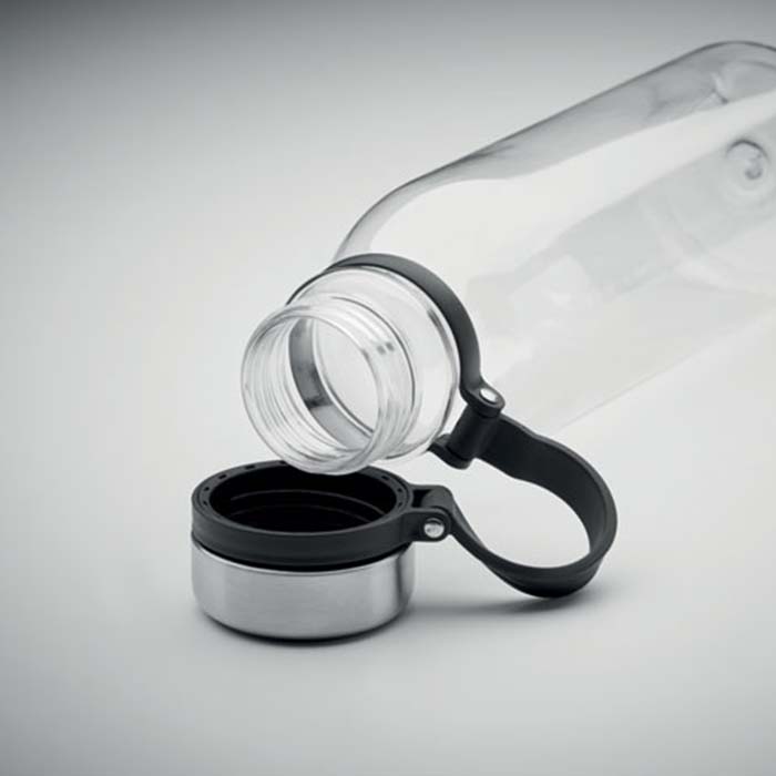 Drinking bottle in RPET with lid in stainless steel and TPR grip makingit easy to carry. BPA free. Leak free. Capacity: 780 ml. Not suitablefor carbonated drinks.