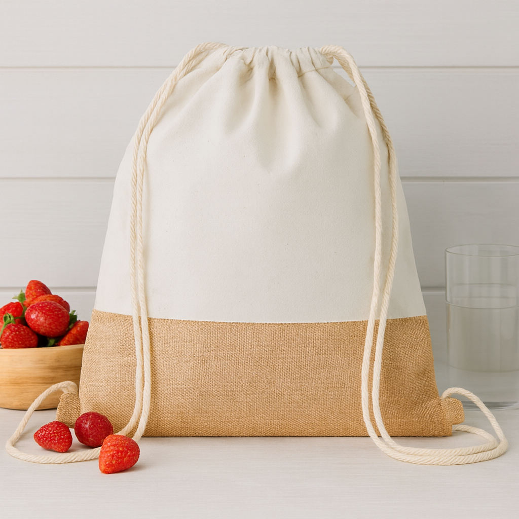 Beautiful sustainable drawstring bag made in cotton with jute detailing. A great addition to your eco-friendly promotional giveaways. 150 gr/m².