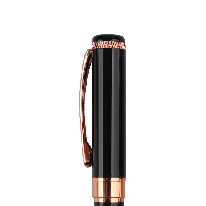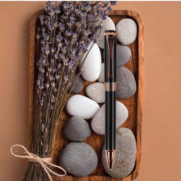 Experience the essence of timeless elegance with Zivat. This meticulously crafted metal pen combines the finest brass and stainless-steel materials, resulting in a refined writing instrument that exudes class and style. Its black spray-painted barrel, adorned with rose gold accents, radiates an aura of luxury. When engraved, it reveals a captivating mirror effect, making it a superb choice for corporate gifting or personal use.